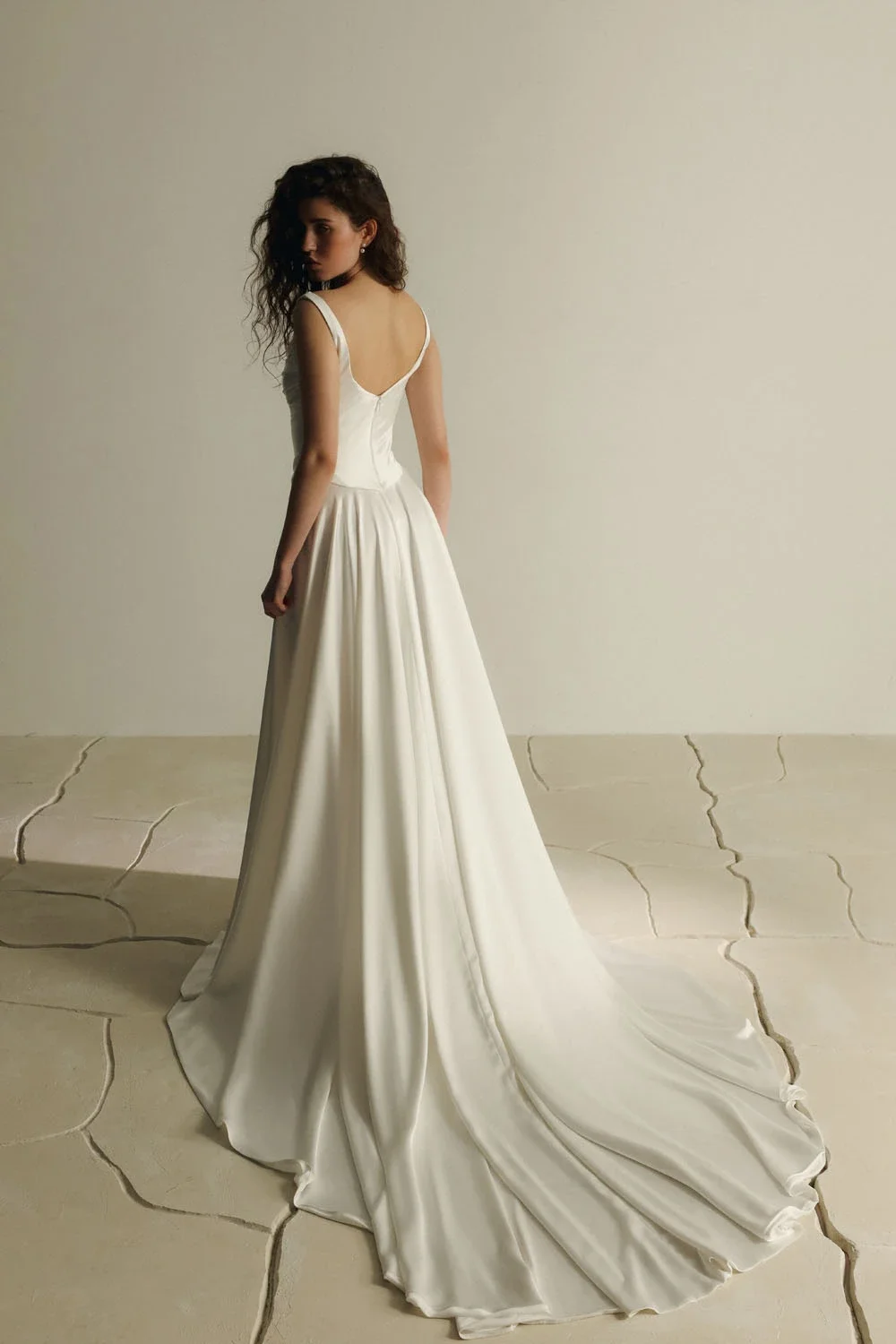 The look is completed with a flowing skirt that extends into a beautiful chapel-length train, adding a touch of classic romance to the modern simplicity.