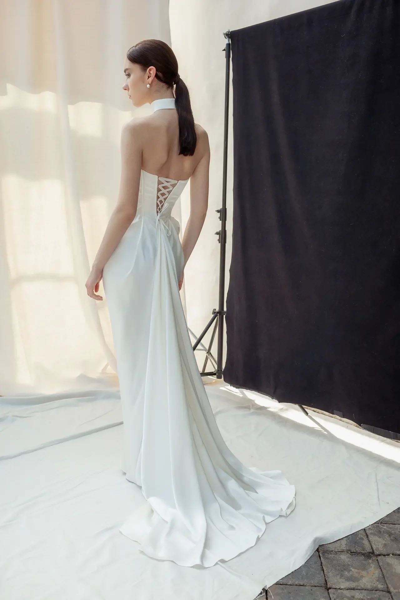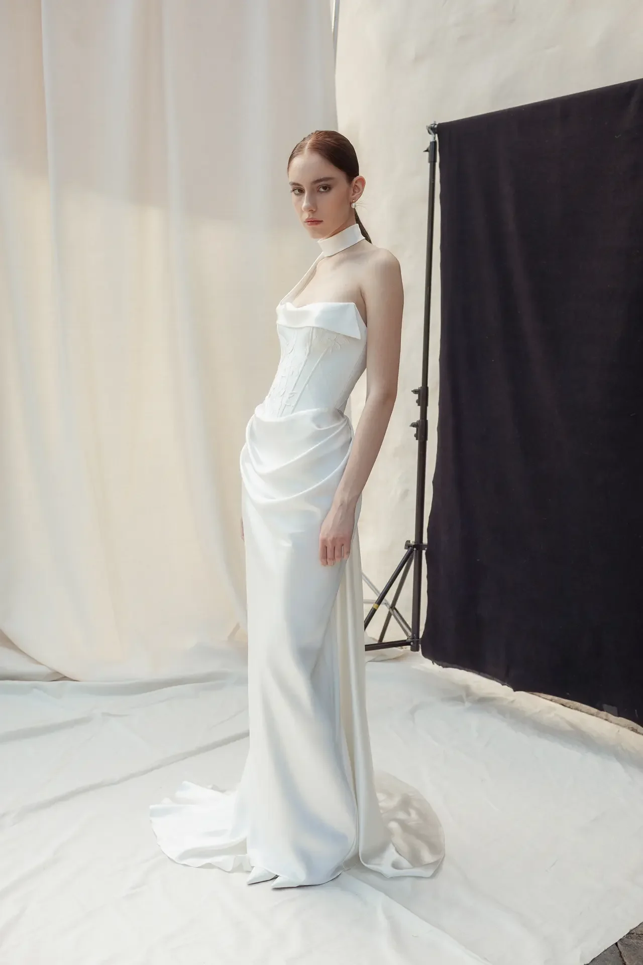 Luxourious Silk satin gown with embossed floral details and an attached choker.