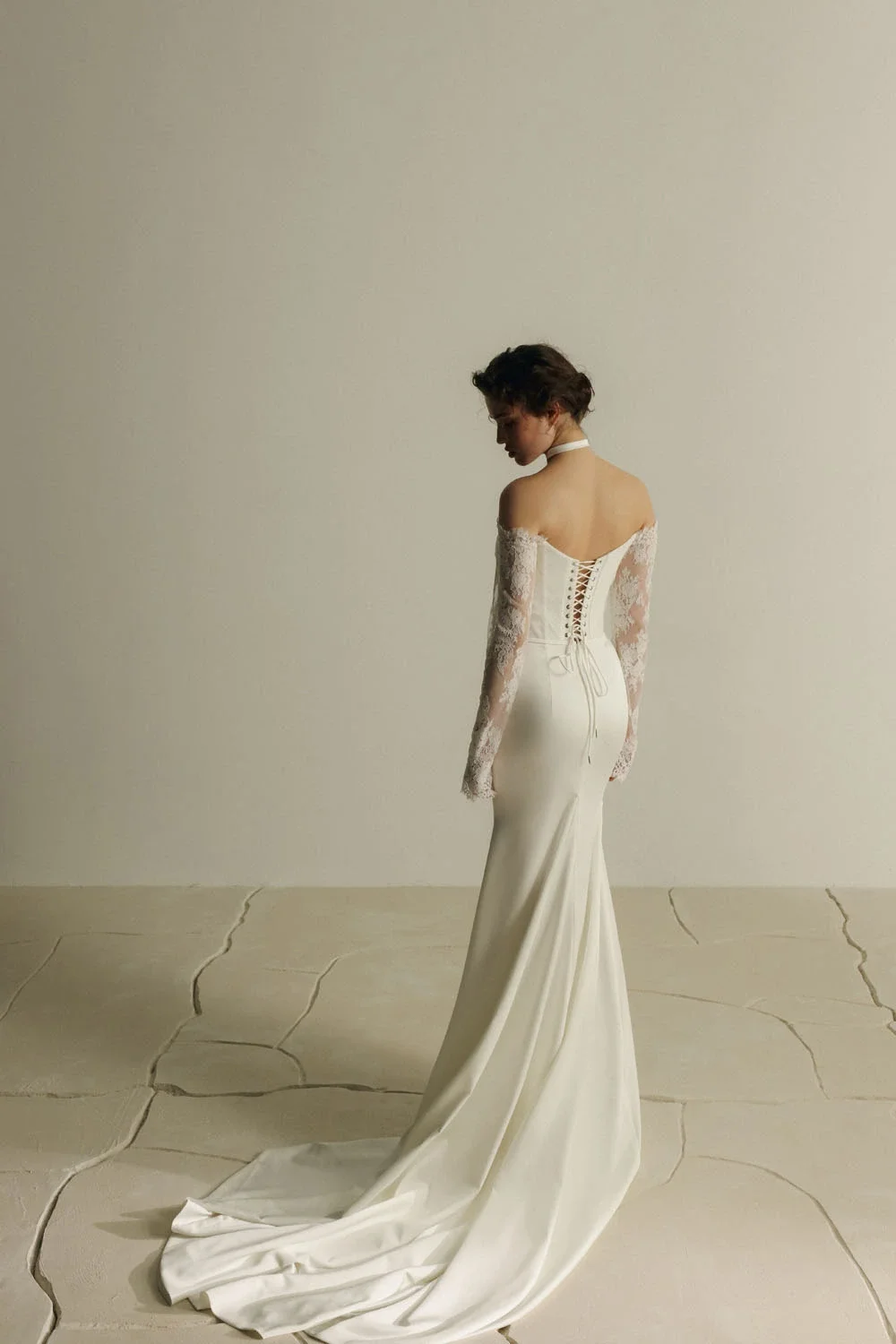 A minimalist off-the-shoulder mermaid gown with long sleeves, crafted from luxurious satin. The corset features soft tulle draping that adds delicate texture, while both the corset and sleeves are adorned with refined Chantilly lace for a romantic touch. The gown is finished with a subtle, elegant train — perfect for brides who appreciate understated beauty with a hint of classic charm