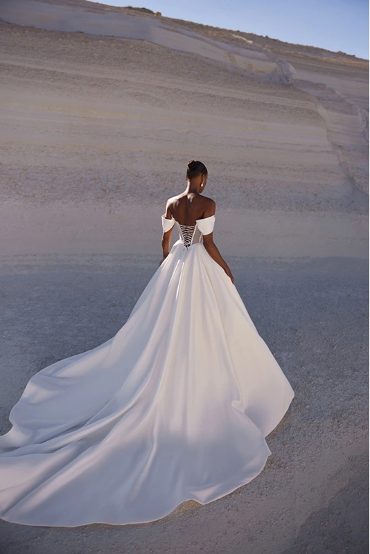Sophisticated gown with a firm corset featuring sheer panels and a softly draped neckline and sleeves. The skirt remains sleek and classic while the full-length slit on the left side adds a hint of allure to the outfit.