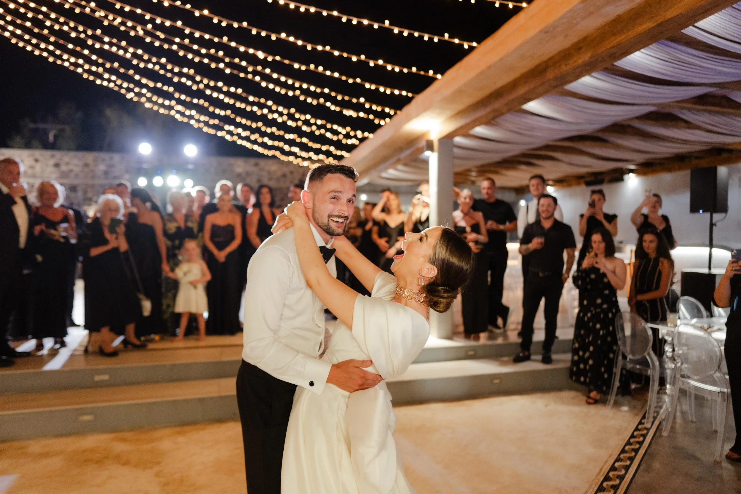 The evening unfolded like a dream, with the sun setting by the sea. Anna and Michael celebrated their first dance under the twinkling lights..