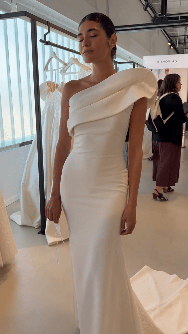 This year, we found ourselves stepping into the Pronovias showroom at Barcelona bridal Fashion Week, the light pouring through tall windows, the gowns waiting in perfectly poised rows. The moment we walked in, we knew - this was going to be something special.