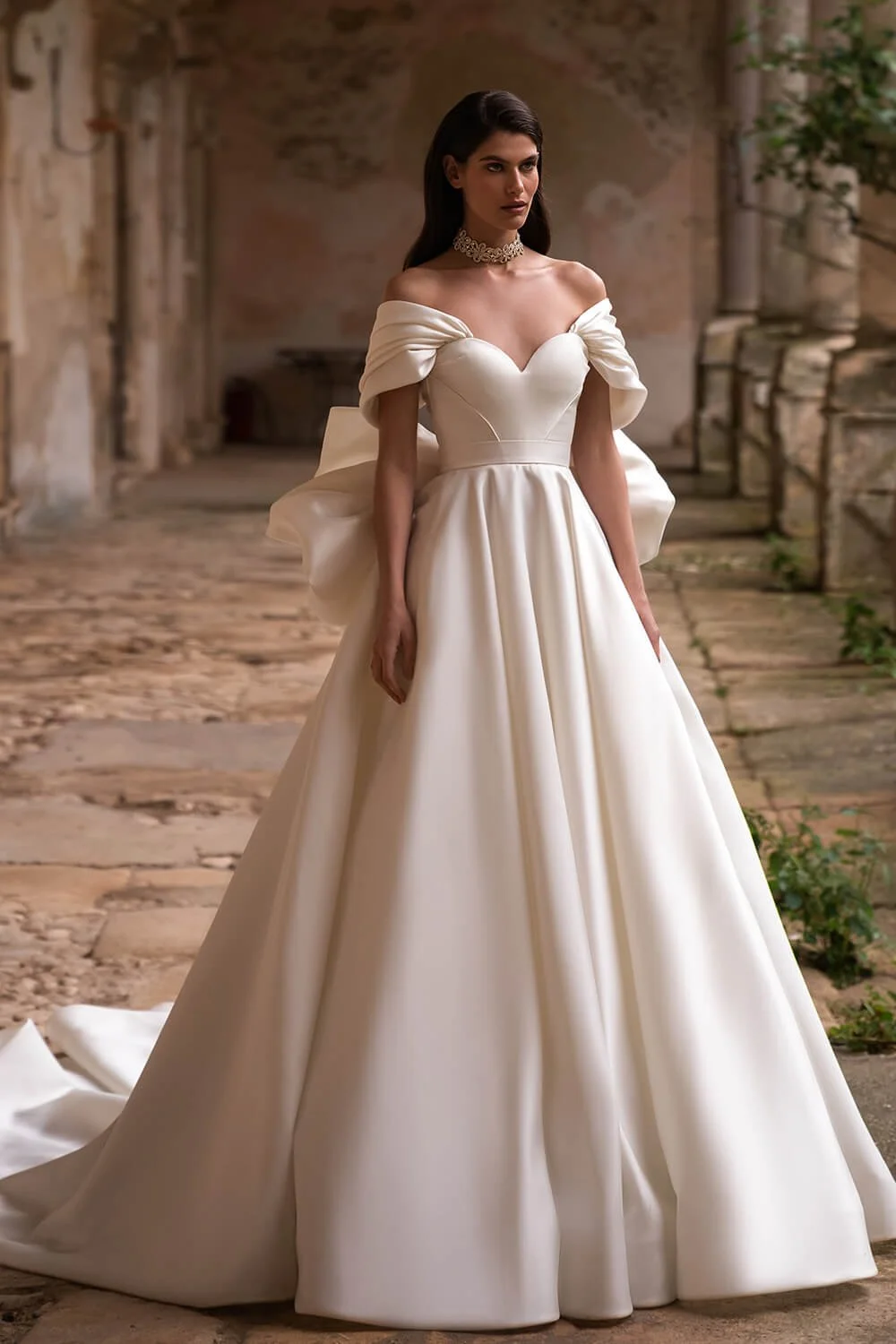A truly princess-inspired royal satin ballgown featured with an oversized statement bow on the back. A sweetheart shaped neckline corset is decorated with fantastic droped off-the-shoulder sleeves that pass to the back. The voluminous full skirt proceeds into a dramatic, pointed cathedral-length train.