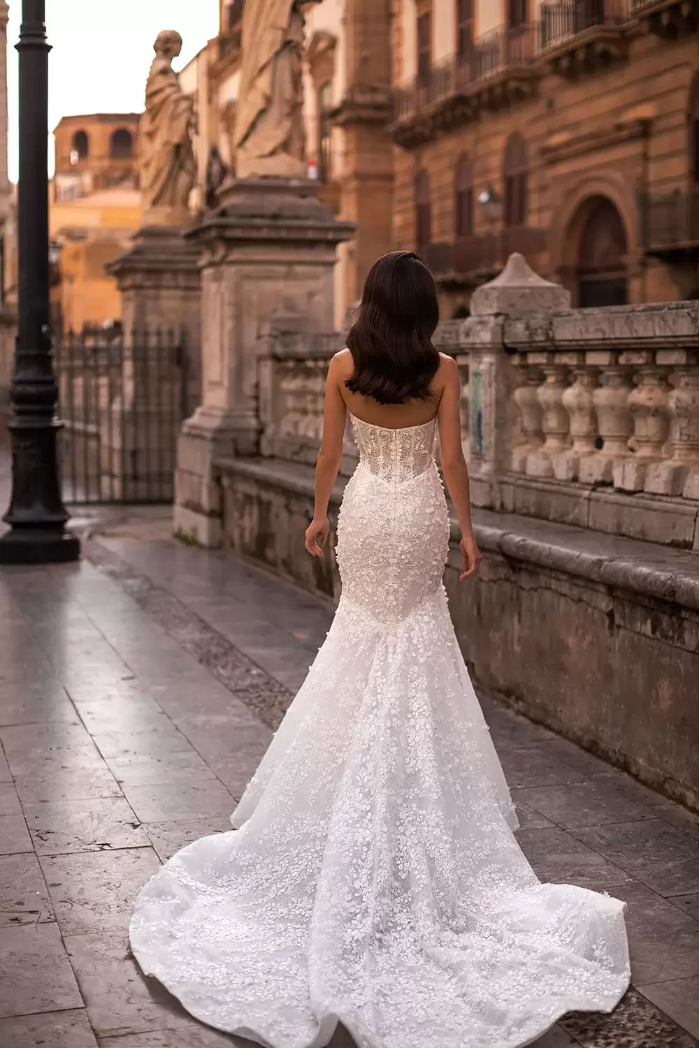 Bernet is a fantastic fitted mermaid gown decorated with scattered hand-embroidered floral appliques on the sweetheart shaped strapless corset and magnificent fit-and-flare skirt. Can be paired with a showstopping detachable sheer lantern sleeves or tailored strong-shouldered long-sleeved bolero of the same lace.