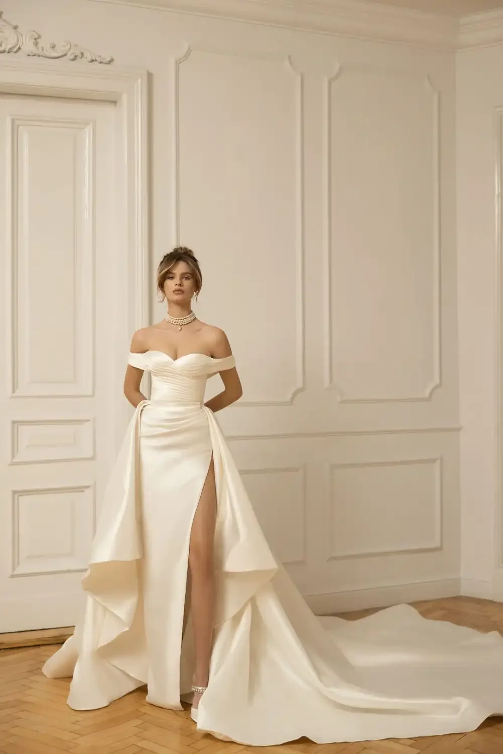 Trendier-than-ever this ruffled Mikdo silk sheath gown with a ball overskirt is perfect to walk the aisle. Lea is accentuated with a layered construction detachable overskirt that adds to the beauty of the gown. The elegant draped corset looms into the same tender draping on the bodice. A sweetheart neckline passes into a beautiful draped straps that give it a glamorous finish and uniqueness opening the back. High slit on the left side of the sheath skirt decorated with draping adds a confident twist and a cathedral train finishes the final look