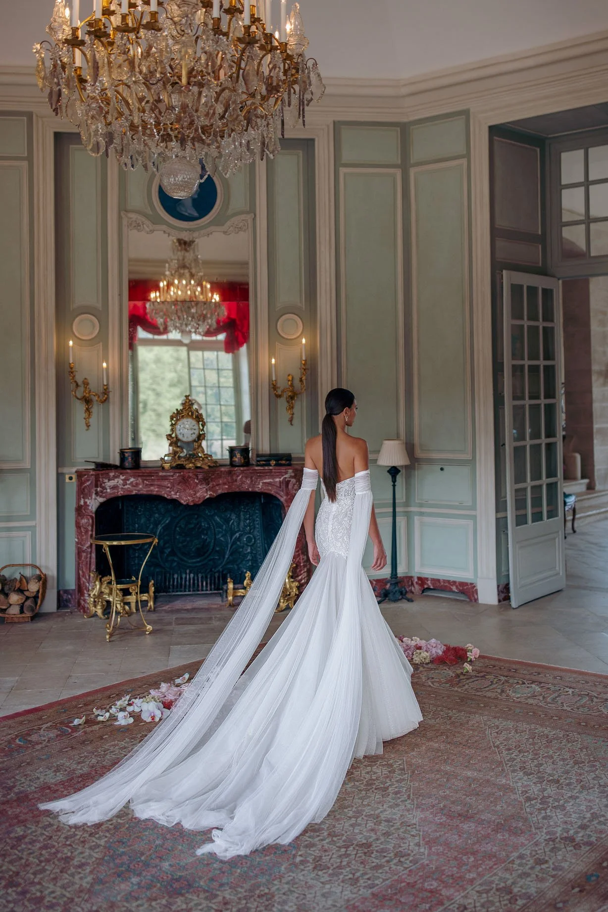 Ocean is a fabulous wedding gown made of tender fabric and shining decor. Strapless corset with lowered shoulders and sweetheart neckline is entirely decorated with small flowers and laconic floral pattern. Throughout the length the mermaid skirt is embellished with floral 3D lace and Tulle inserts. The special twist hides in detachable sleeves with multiple draped pannels and long wings that trickle down to the train length. With spectacular luminous satin embroidery and metres of eyelash Tulle she takes up to 96 hours of handwork.