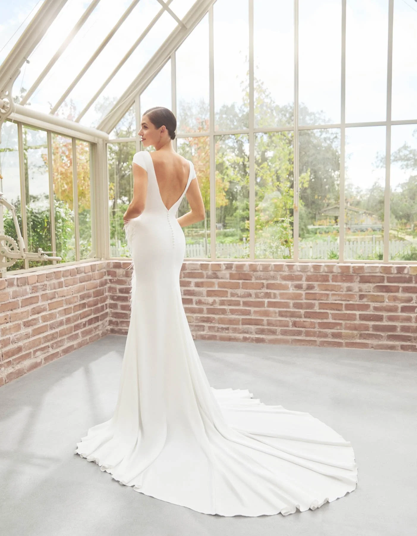 This mermaid-style dress pays tribute to the Maison’s codes of elegance. Crafted in the iconic crepe fabric of the house, its design stands out for the opening in the skirt highlighted with marabou feathers, and for a striking open back